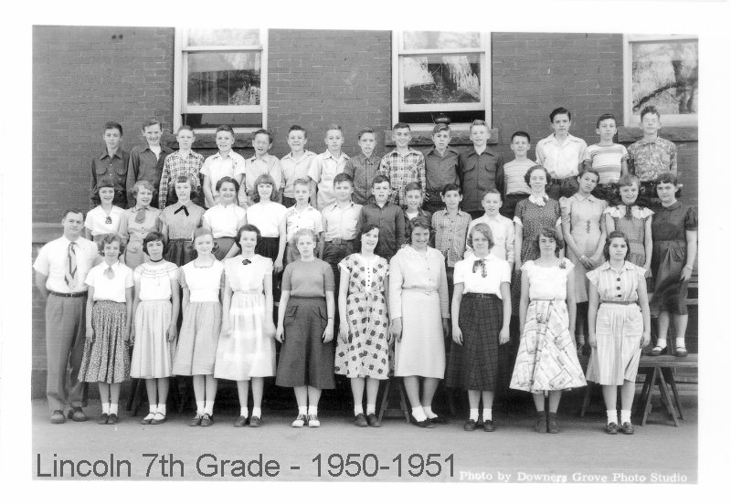 This photo is of Mr. Higgins 7th grade class of 1951 at Lincoln School. Since it is difficult to make out some of the students, you can click here for a full-size copy of the picture to study and identify people. |