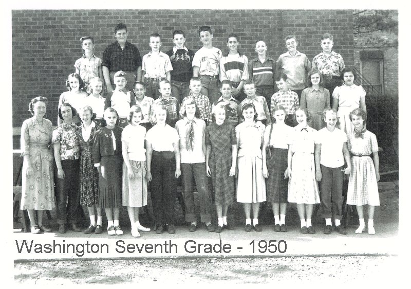 This photo is of Ms. A. Daigh 7th grade class at Washington School. We are working on putting names to the faces & have been successful with most of them. Since it is difficult to make out some of the students, you can click here a full-size copy of the picture to study and identify people. |